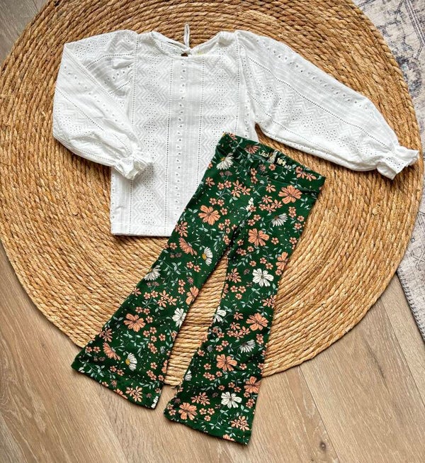 Heerlijk luchtig bloesje gemaakt van een 100% katoenen broderie met pofmouwen en een strik op de rug. Door het rechte lijfje ook heel erg geschikt voor onder een giletje