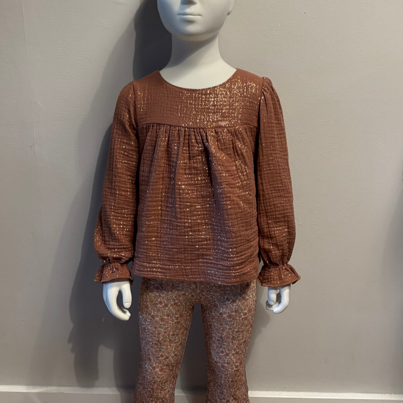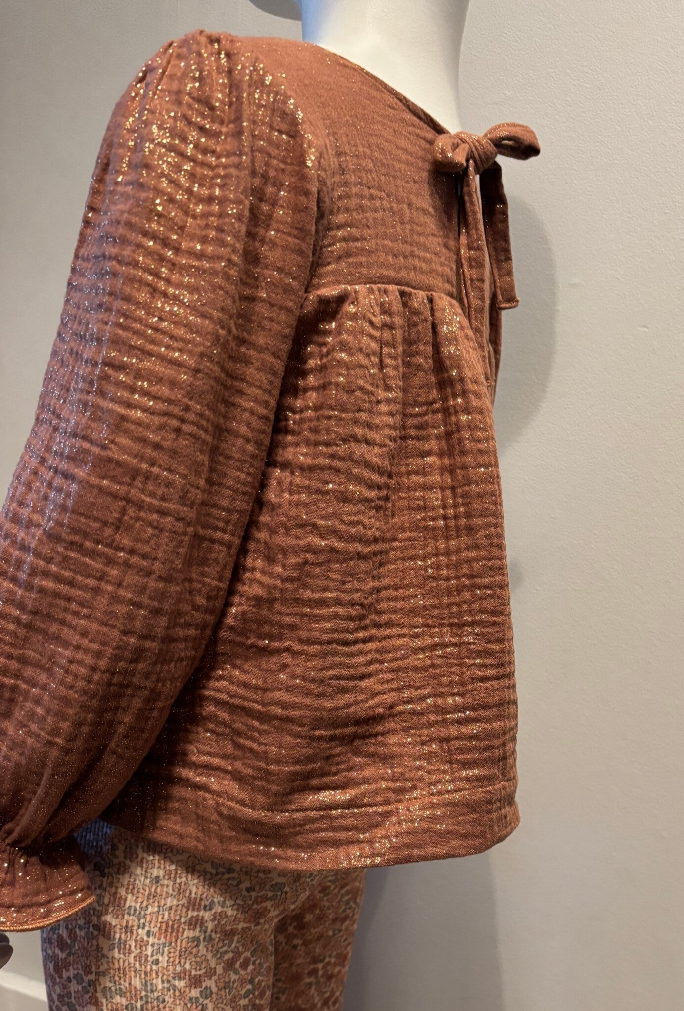 Deze feestelijke blouse is gemaakt van een 100% katoenen hydrofielstof en heeft een glitter in de stof. Het bloesje sluit met een strik op de rug en heeft roezels aan de onderkant van het mouwtje.