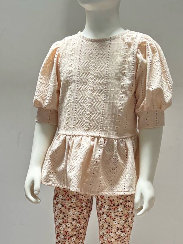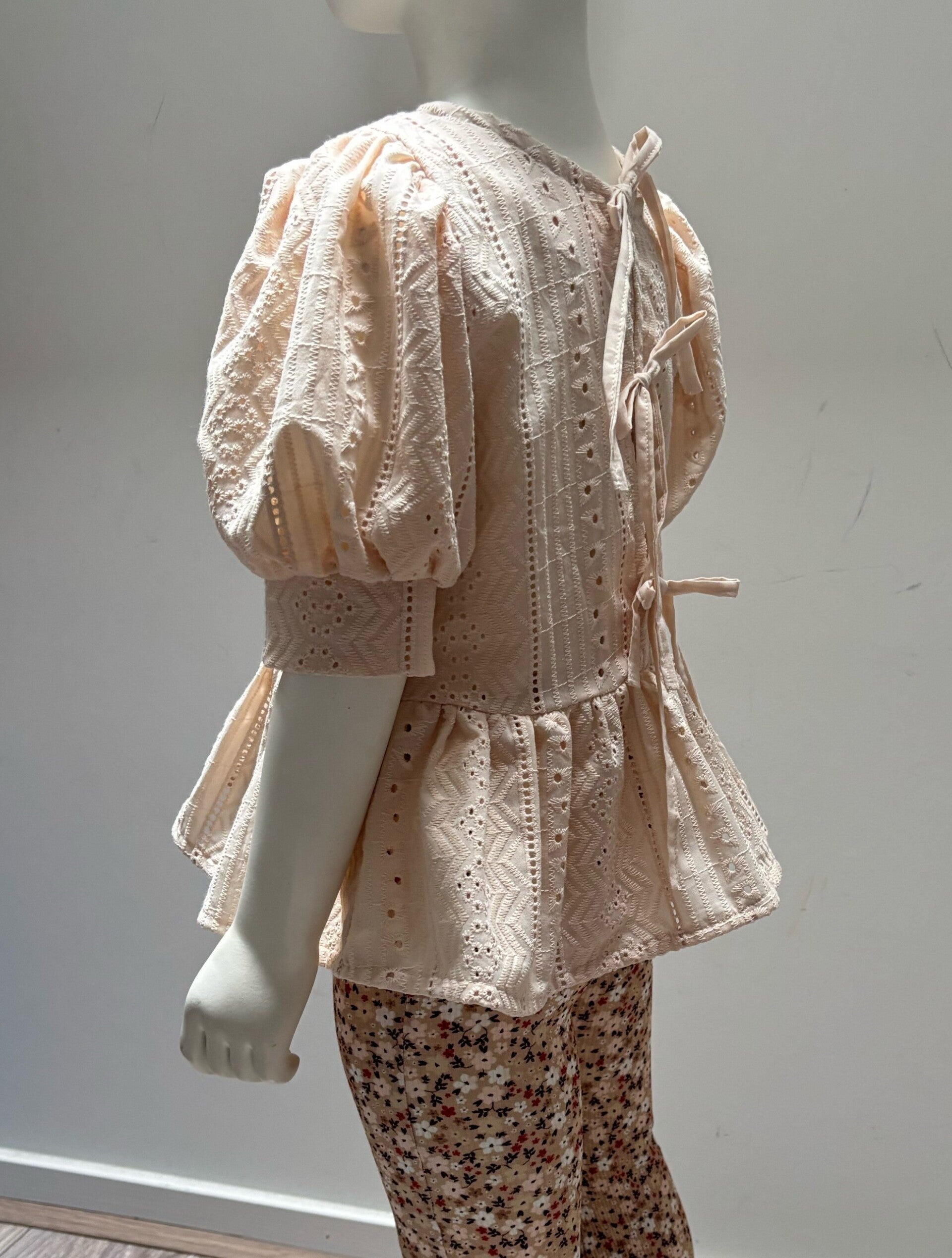 Peplum Blouse Cinamon Fijn bloesje gemaakt van een 100% katoenen broderie stof. Het bloesje heeft roezels aan de onderkan, pofmouwen en sluit aan de voorkant met strikjes.