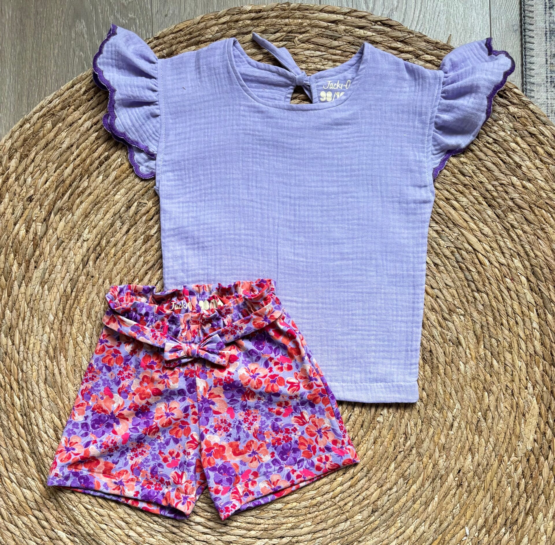 Heerlijk luchtig hydrofiel shirtje gemaakt van een 100% katoenen stof. Het shirtje heeft ruffles bij de mouwen en is een oversized fit. Het shirtje sluit met strikjes op de rug.