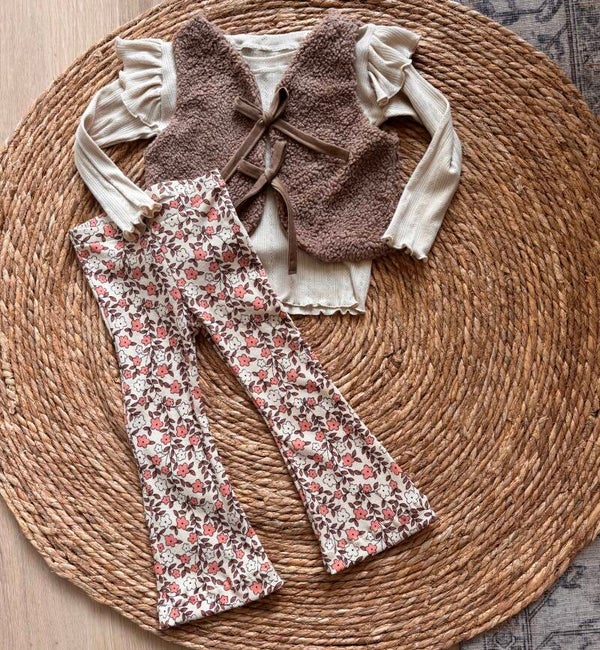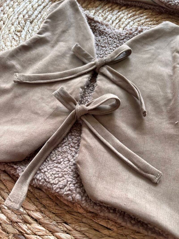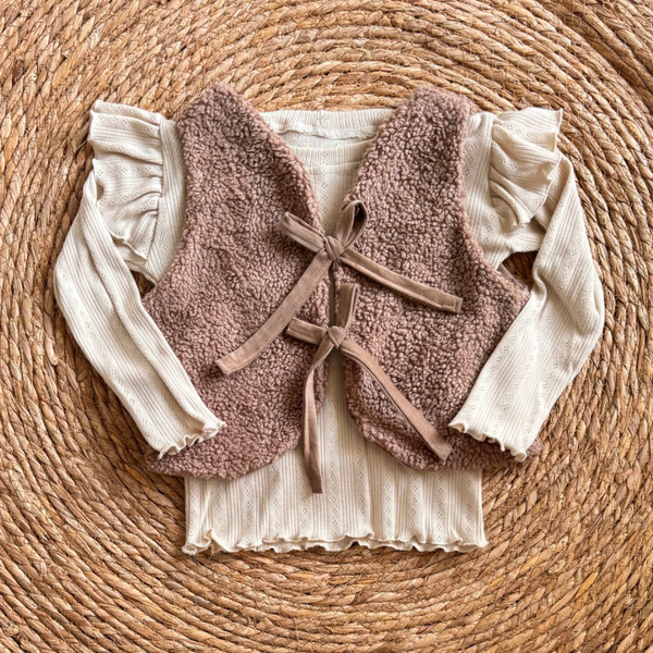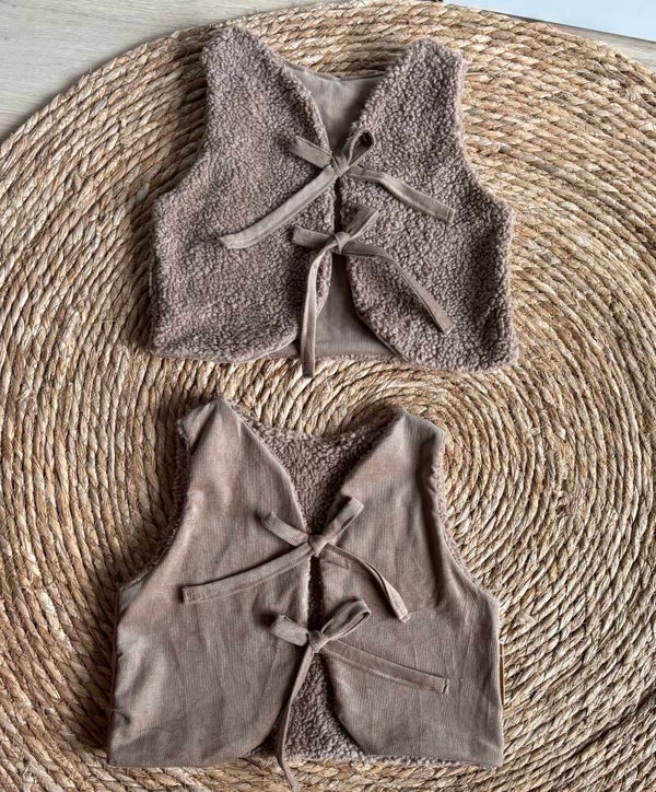 Dit giletje is gemaakt van een katoenen teddy aan de ene kant en een katoenen ribcord aan de andere kant en sluit met strikjes. Het giletje is volledig omkeerbaar en dus ook andersom te dragen.
