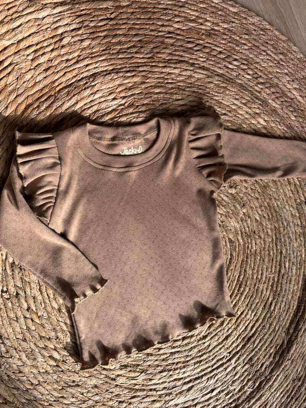 Dit ruffleshirtje is gemaakt van een hele fijne 100% katoenen pointellestof. Het shirtje heeft ruffles bij de mouwtjes en is met een rolzoompje afgewerkt bij de onderkant van het shirtje en de mouwtjes. Ideaal om te combineren met een giletje