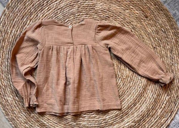 Blouse gemaakt van een katoenen Hydrofiel stof in de kleur camel. Het blousje heeft een knoopje op de rug en pofmouwtjes.