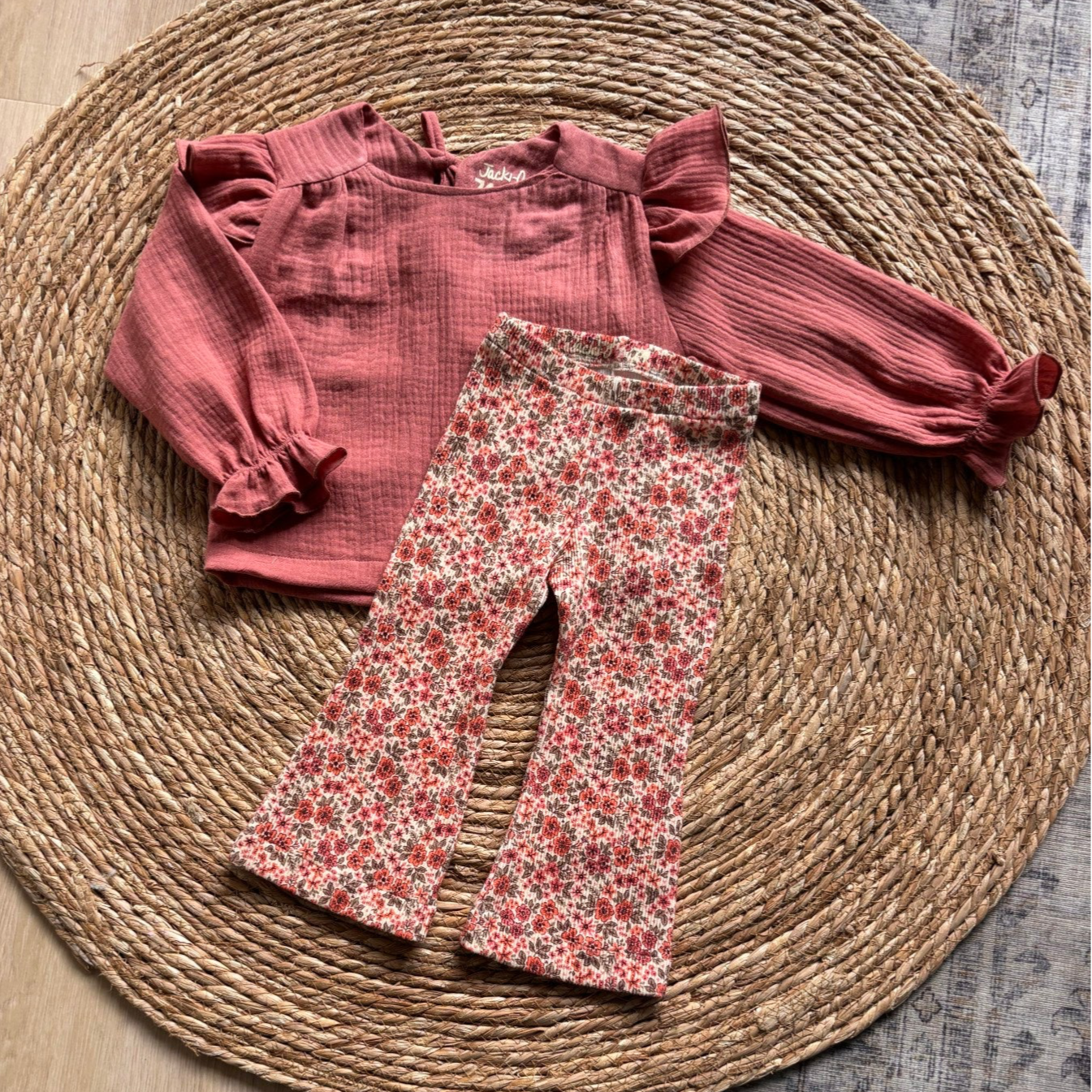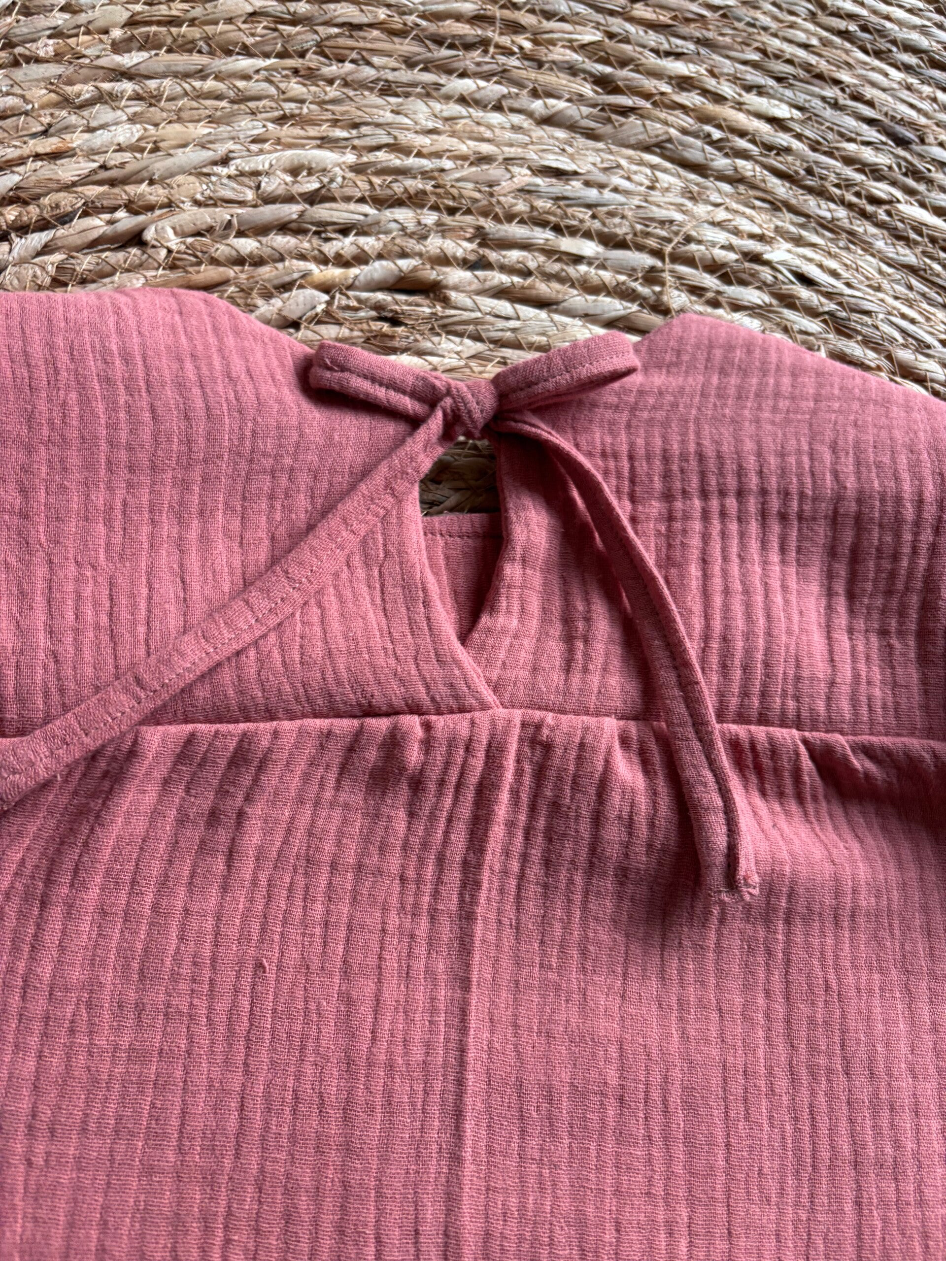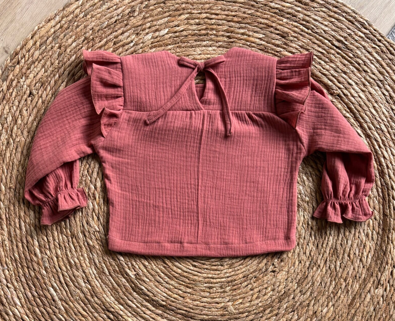 Heerlijk luchtig bloesje gemaakt van een 100% katoenen hydrofielstof met een kleine stipjes. De blouse heeft ruffles bij de mouwen en sluit op de rug met een strik.