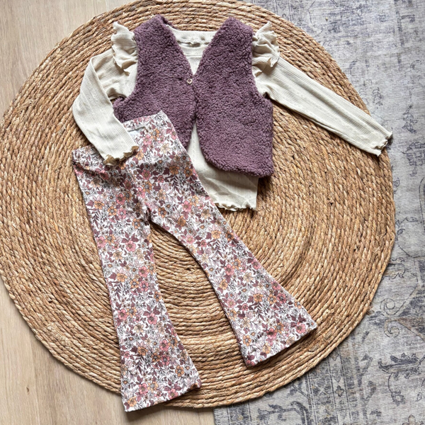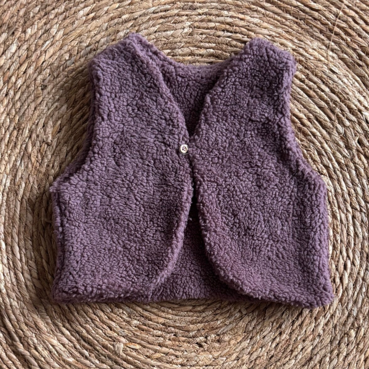 Dit giletje is gemaakt van een 100% katoenen teddy. Het giletje heeft de stof zowel aan de binnen als de buitenkant zodat hij heerlijk zacht en warm draagt en ook netjes afgewerkt is. Leuk om te combineren met een ruffleshirtje.