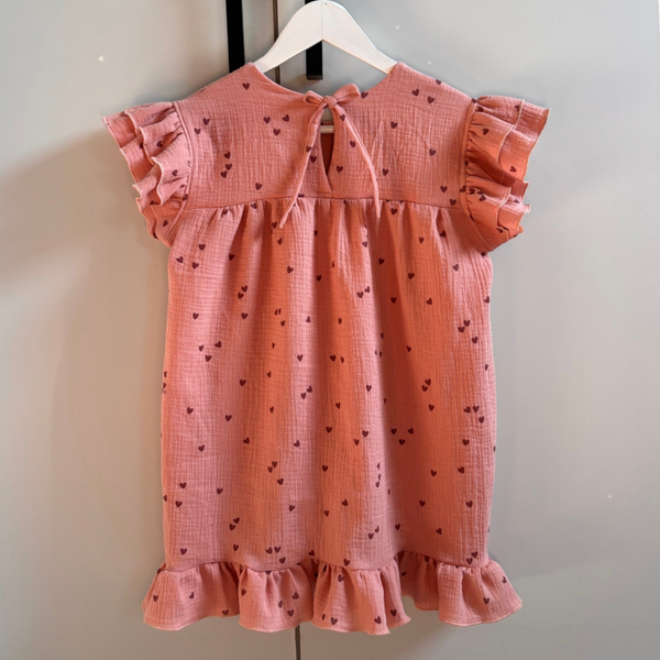 Heerlijk luchtig jurkje gemaakt van 100% hydrofielstof. Het jurkje heeft dubbele roezels als mouwtjes, sluit op de rug met een strik en heeft nog een roezel onderaan.