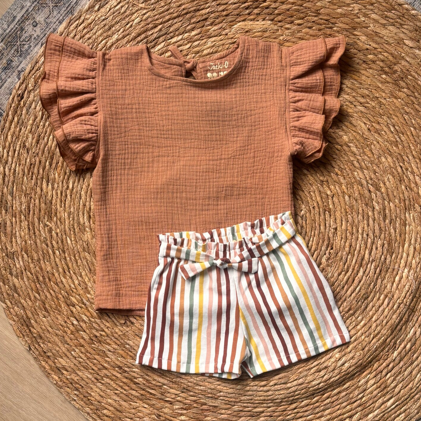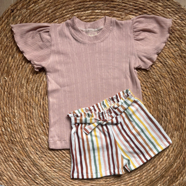 Short gemaakt van een katoenen tricot met een strepenprint. Het broekje heeft een paperbag waist en een strik vooraan.